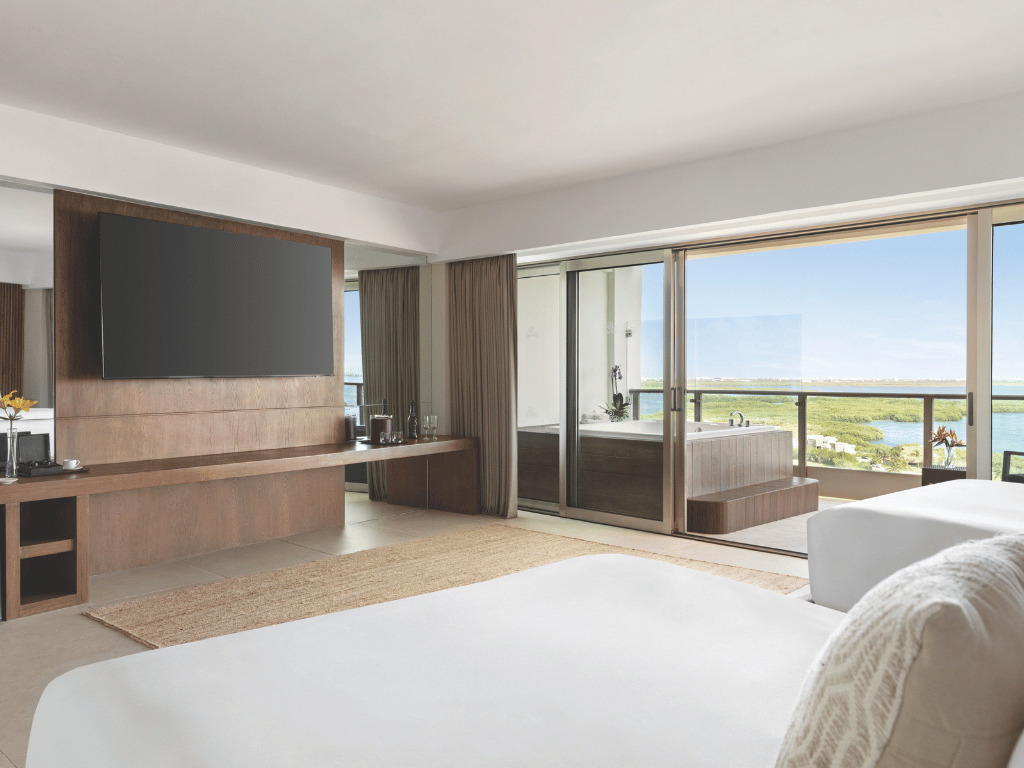La Gran Master Suite Sunset View King, es una de nuestras suites más amplias. Cuenta con una cama King, una sala de estar separada y un balcón grande con jacuzzi exterior, perfecto para ver los atardeceres sobre la laguna. Con capacidad para 4 personas (2 adultos y 2 niños), es ideal para familias que buscan más espacio y comodidad.