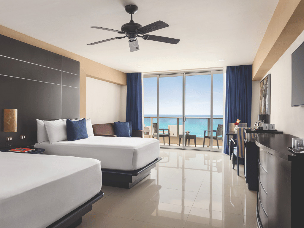 La Suite Estándar Doble es ideal para familias pequeñas o amigos que buscan confort y practicidad. Equipada con dos camas dobles y un balcón privado para disfrutar de vistas parciales al mar o a la laguna. La capacidad máxima es de 4 personas (2 adultos + 2 niños, o 3 adultos + 1 niño). Incluye minibar reabastecido diariamente, Wi-Fi gratuito y amenidades funcionales que hacen más cómoda tu estancia después de un día lleno de actividades en el resort.