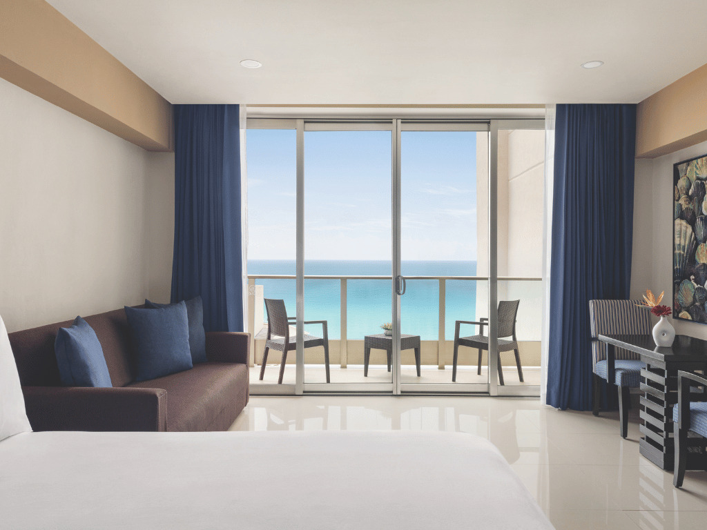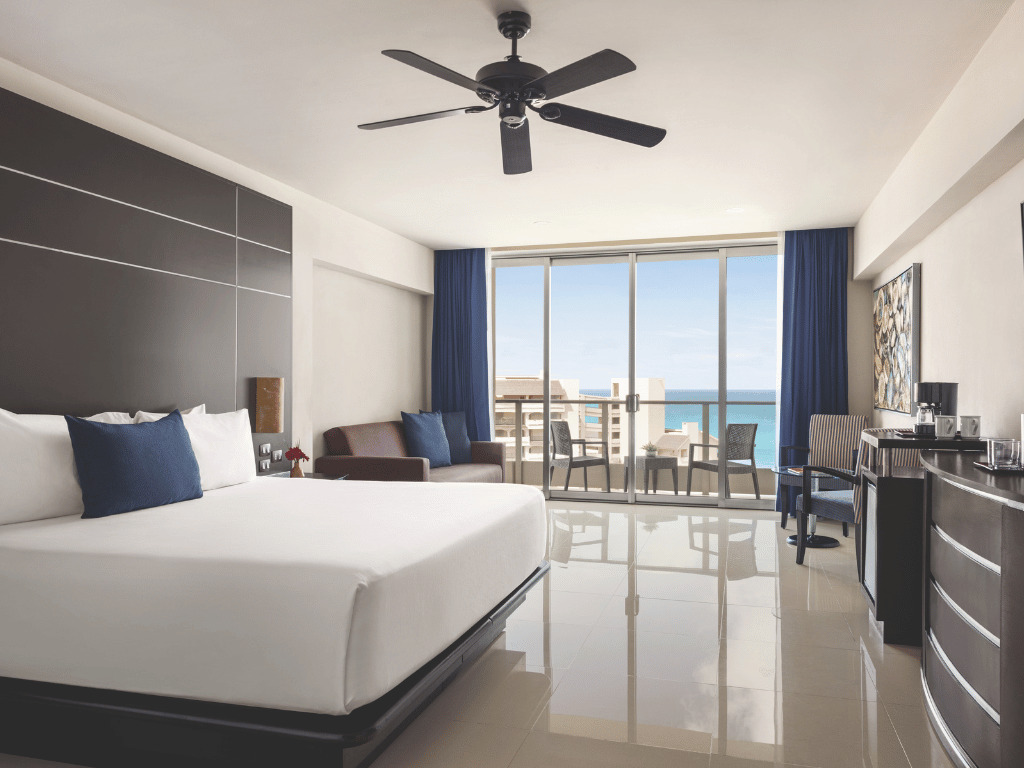 Nuestra Suite Estándar King, es ideal para tu descanso en Cancún. Cuenta con una cómoda cama King-size y un balcón privado donde podrás disfrutar de vistas parciales al mar o a la laguna. Equipada con todo lo necesario para una estancia agradable, incluyendo minibar con bebidas y Wi-Fi. Perfecta para 2 adultos y 1 niño, ofreciendo espacio para relajarse después de un día de actividades.
