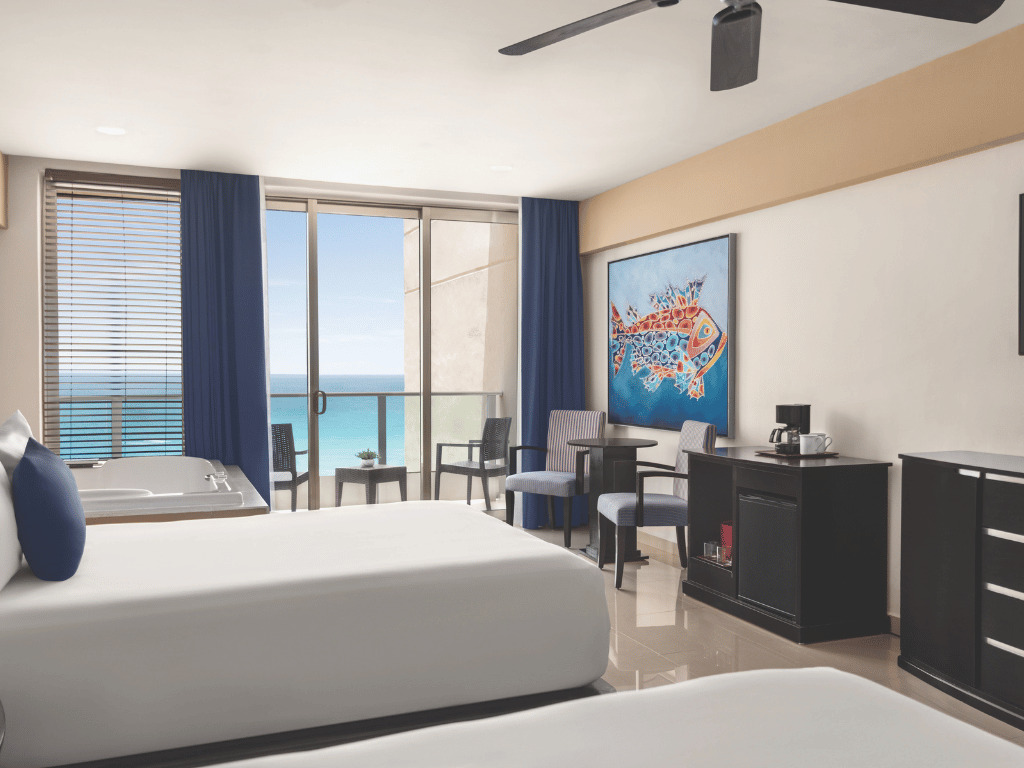 Nuestra Premium Suite Doble, es ideal para familias o amigos, con dos camas dobles y un jacuzzi dentro de la suite. Disfruta de las vistas parciales al mar desde el balcón. Tiene capacidad para 4 personas, ofreciendo un ambiente agradable para todos.